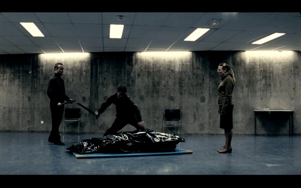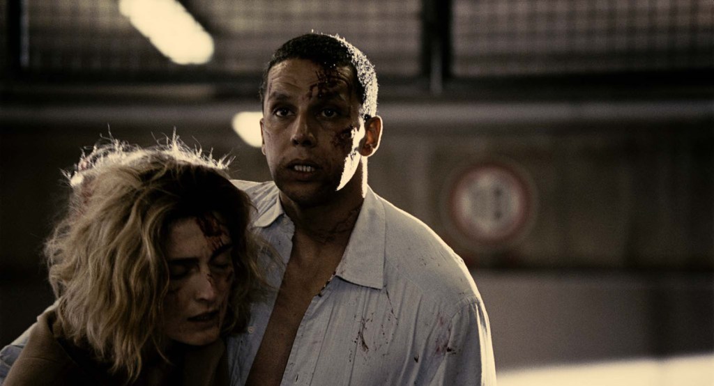 C’est dans ce contexte “Orwellien” en diable qu’évoluent Philippe et Marie, deux jeunes gens cassés par la vie, et dont l’histoire d’amour va traverser le récit. Sami Bouajila et Julie Gayet sont absolument remarquables, interprétant leurs personnages avec cette retenue et cette froideur totalement en phase avec l’univers du film. Un univers que Jean-Baptiste Léonetti explore à l’aide d’une mise en scène d’une précision chirurgicale. Chaque plan, chaque mouvement de caméra, est utile à la découverte de ce monde cloisonné, clinique. Le jeune cinéaste impose une maîtrise assez bluffante pour un premier long. Graphiquement, Léonetti joue avec les symboles, les surcadrages, les lignes fuyantes de ses décors ou celles au contraire emprisonnant les personnages, apportant une sensation de claustrophobie et d’étouffement, un certain malaise psychologique. La découverte de cet univers se fait essentiellement par petites touches visuelles, les dialogues sont à la portion congrue, même si la bande-son reste riche et très travaillée. Pourtant, il faut reconnaître qu’apprécier ce Carré Blanc à sa juste valeur nécessitera un certain effort de la part du spectateur. L’ensemble des ingrédients réunis par Jean-Baptiste Léonetti pour concevoir son film ne sont pas du style à prendre le spectateur par la main. Cet univers froid et géométrique demande un minimum d’implication pour parvenir à goûter les qualités d’une première oeuvre qui ne dépareillerait pas aux côtés de monuments tels que Soleil Vert, Brazil et autres Orange Mécanique…