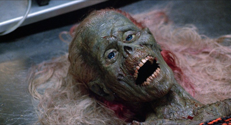 Le film part d’un constat aussi inquiétant que loufoque : des barils militaires renfermant des cadavres (issus du film de Romero ?) sont stockés dans une entreprise de fournitures médicales, à la merci du premier abruti venu. Et ça tombe bien, des personnages hauts en couleurs, on en a une palette ici. Que ce soit Franck et Freddy, deux employés qui commettent l’irréparable en libérant un gaz toxique et contaminant, permettant aux morts de se relever… Ernie, le spécialiste en crémation… Ou encore cette bande de punks anarchistes qui investissent un cimetière en pleine nuit. Dans Le Retour des morts-vivants, l’horreur est traitée sur le ton de l’humour absurde et du second degré, sans pour autant sacrifier les aspects les plus ouvertement horrifiques. Personnages et dialogues sont volontairement caricaturaux, dans une démarche que l’on pourrait appréhender, avec du recul, comme une approche quasi-méta du genre. Cette recette outrancière a beaucoup fait pour la popularité du film. Mais elle ne fonctionnerait pas aussi bien sans le soin apporté aux effets spéciaux. Des débordements gores aux zombies en animatronique, aussi soignés que délirants, les trucages tiennent encore sacrément bien la route aujourd’hui. C’est d’ailleurs dans l’approche des morts vivants que la différence avec les films de George A. Romero se fait le plus sentir, puisqu’ici, ce ne sont pas des cadavres en putréfaction qui déambulent lentement, mais des affamés se déplaçant à toute allure. Et, comble du sacrilège, qui se trouvent dotés de parole. Une révolution dans la représentation du mort vivant. Le fameux « Braiiiiiiin » déclamé par les cadavres a ainsi autant marqué les consciences que le film lui-même. S’intégrant dans les canons du genre avec son lieu unique, son unité de temps resserrée en une seule nuit, Le Retour des morts–vivants baigne dans une ambiance horrifique, parfois inquiétante, souvent amusante mais toujours gorgée de générosité.