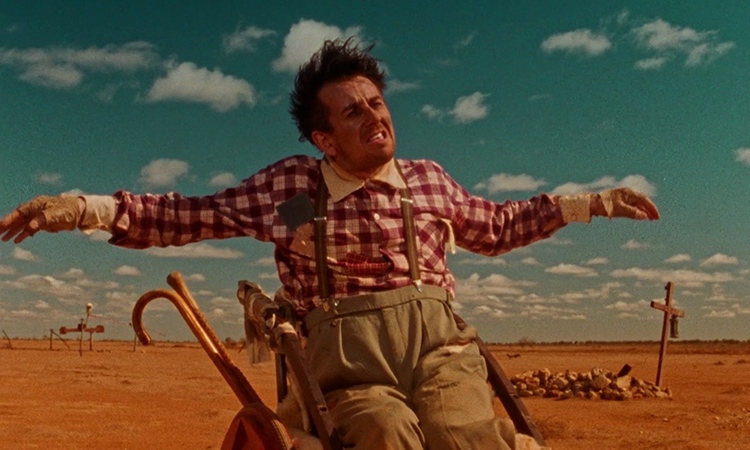 Dans cette première réalisation que Proyas tourna à 26 ans après une longue expérience dans le clip musical, on n’évolue pas dans la noirceur d’un The Crow ou d’un Dark City. Bien au contraire. C’est sous un soleil de plomb et dans un paysage désertique balayé par le vent que le réalisateur pose son décor, pour ce qui s’annonce comme un film à forte sensibilité post-apocalyptique. On y découvre Felix Crabtree et sa sœur Betty, qui vivent en autarcie dans le désert australien. Lui est cloué à son fauteuil roulant et s’accroche à son obsession de pouvoir un jour voler. Elle apparaît enfermée dans un personnage de femme bigote et hystérique. Leur quotidien est bouleversé par l’arrivée d’un étranger ayant trois poursuivants à ses trousses. Un pitch minimaliste pour une œuvre que l’on devine tournée à l’économie, et verrouillée sur ses trois protagonistes, le contexte « post-apo » ne servant finalement que de toile de fond au récit. Spirits of the Air, Gremlins of the Cloud décrit un univers solaire et déshumanisé, au sein duquel la foi et le mysticisme tiennent une place prépondérante, que ce soit pour Felix et sa conviction profonde de réaliser un engin volant, ou Betty qui dissimule ses frustrations derrière des maquillages outranciers et des symboles religieux envahissants.