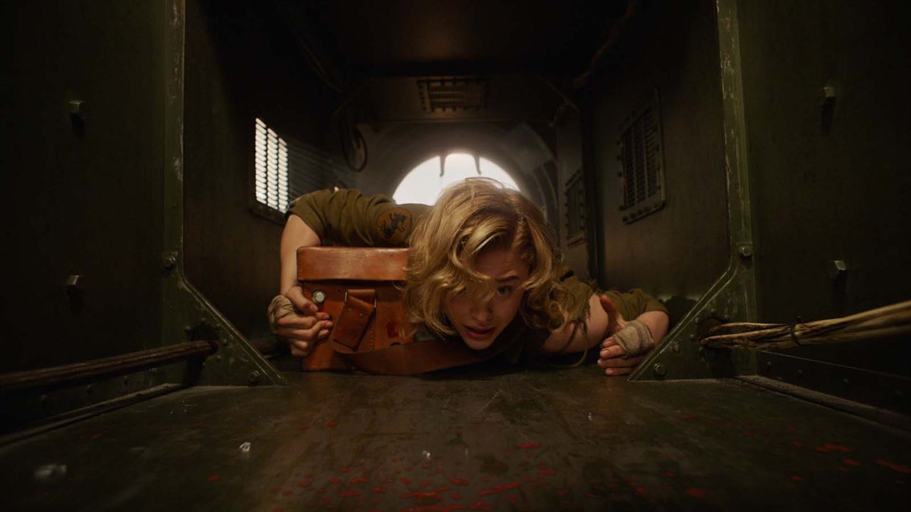 Dans sa proposition horrifique, Shadow in the Cloud n’apparaît pas comme le meilleur représentant du film de monstre. Renvoyant autant au sketch La Mascotte de Steven Spielberg dans l’anthologie Histoires Fantastiques qu’au segment Cauchemar à 20 000 pieds réalisé par George Miller pour le film La Quatrième Dimension, le concept de la créature planquée dans l’avion est ici efficace mais pourtant pas central, juste un élément perturbateur et venant dérégler un peu plus encore une situation déjà mal embarquée pour les personnages. Sa créature, mixe entre une chauve-souris et un singe, n’a pas les épaules pour imposer une menace suffisamment forte pour emporter l’adhésion. Ce qui emballe bien plus, ce sont les choix nets de la réalisatrice Roseanne Liang qui, pour son premier long-métrage, ne se laisse pas aller à la facilité en multipliant les défis. Le premier d’entre eux réside dans le choix d’installer son héroïne, et par extension la caméra qui la suit intégralement, dans un lieu exigu et unique durant une grande partie du film. La tourelle de combat au sein de laquelle se retrouve confinée la pilote Maude Garrett offre un sacré défi de mise en scène, un exercice de style dont la réalisatrice se sort haut la main, grâce à un découpage et à des choix drastiques d’axes de caméra. Cette unité de lieu s’accompagne d’une gestion des dialogues maligne et pas moins risquée, puisque les échanges entre la pilote et le reste de l’équipage s’effectuent uniquement par le biais de la radio, et donc du son, dans un exercice fluide et faisant avancer l’action avec une économie de moyens assez remarquable. Un procédé là aussi osé, mais au final payant, qui s’accompagne d’un double suspense plutôt ludique autour de l’incertitude planant sur l’identité du personnage principal et surtout, le MacGuffin lié à son bagage mystérieux, dont le contenu dévoilé va constituer un véritable point charnière de l’action, où tout va dès lors partir en vrille.