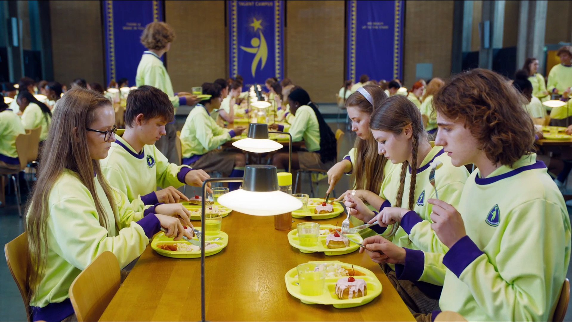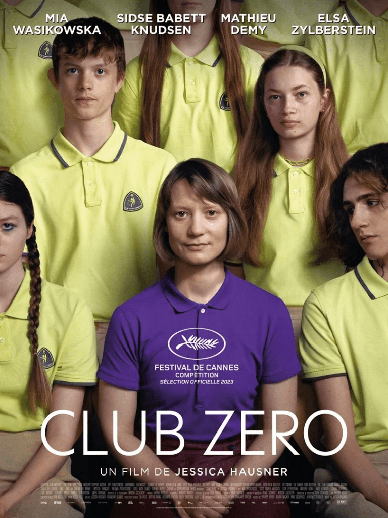 Cinéaste autrichienne, Jessica Hausner revient après Hôtel, Lourdes et Little Joe pour nous montrer un nouveau métrage plutôt particulier. Club Zéro nous conte le récit de Miss Novak, professeure, qui rejoint un lycée privé où elle initie un cours de nutrition avec un concept innovant, un régime très spécial du nom d’alimentation consciente. Sans éveiller les soupçons des professeurs et des parents, certains élèves tombent sous son emprise et intègrent le cercle très fermé du mystérieux « Club Zéro ». Dès le premier plan, le ton est donné avec une photographie « IKEA » à l’artificialité vomitive (après tout c’est Martin Gschlacht qui s’en charge, lui qui s’était occupé de l’excellente lumière de Goodnight Mommy, même si les images y sont assez dissemblables, sauf dans l’imparable sens du cadre) avec sa palette de couleur fade et désenchantée ; cette première phrase peut faire paraître la mise en scène comme un défaut, mais détrompez-vous, c’est sa plus grande qualité. Tout comme les meubles présents et, plus globalement, le décor, exactement placé, millimétré finalement. Millimétré, c’est un peu le maître-mot de Club Zéro, à commencer par la direction d’acteurs d’Hausner, afin de faire ressortir leur meilleur, notamment de Mia Wasikowska ou d’Elsa Zylberstein à contre-emploi, ainsi qu’une tripotée de jeunes acteurs prometteurs. Ces derniers jouant des personnages finement écrits, Hausner et sa coscénariste Géraldine Bajard déjouent habilement les archétypes et provoquent empathie (particulièrement les jeunes et les parents), tout en les critiquant et à travers eux l’époque, crédule, où l’on peut avaler n’importe quelle absurdité.