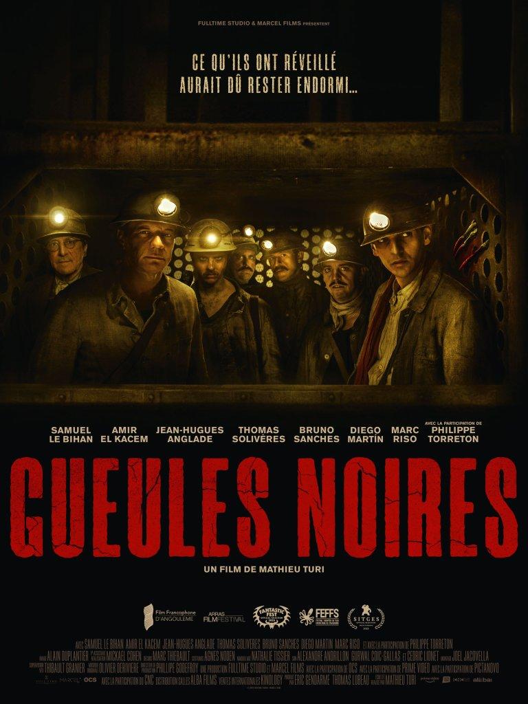 Réalisateur français en vogue ces derniers temps chez les fanatiques de cinéma de genre, Mathieu Turi a démarré sa carrière en tant qu’assistant réalisateur chez, par exemple, Quentin Tarantino pour son Inglorious Bastards. Il sort quelques courts-métrages avant de démarrer dans le long avec Hostile en 2017, film n’ayant pas rencontré un fort succès critique mais n’ayant pas empêché la sortie de son passable mais néanmoins assez intéressant Méandre, trois ans plus tard. Son troisième film, Gueules Noires, après quelques passages en festival, est sorti dans les salles françaises le 15 novembre 2023. En 1956, dans le nord de la France. Une bande de mineurs de fond se voit obligée d’accompagner un professeur pour qu’il réalise des prélèvements à mille mètres sous terre. Emprisonnés après un éboulement, ils découvrent une crypte d’un autre temps, et réveillent sans le savoir quelque chose qui aurait dû rester endormi… Le film démarre très bien, avec une introduction et vingt minutes suivantes franchement bien menées et prometteuses pour la suite, avec déjà quelques atouts comme l’utilisation plutôt efficace de la lumière ou encore la gestion de la tension, résultantes d’une mise en scène plutôt réussie. En ce sens, la photographie d’Alain Duplantier favorise considérablement l’immersion du spectateur dans cet univers de ténèbres.