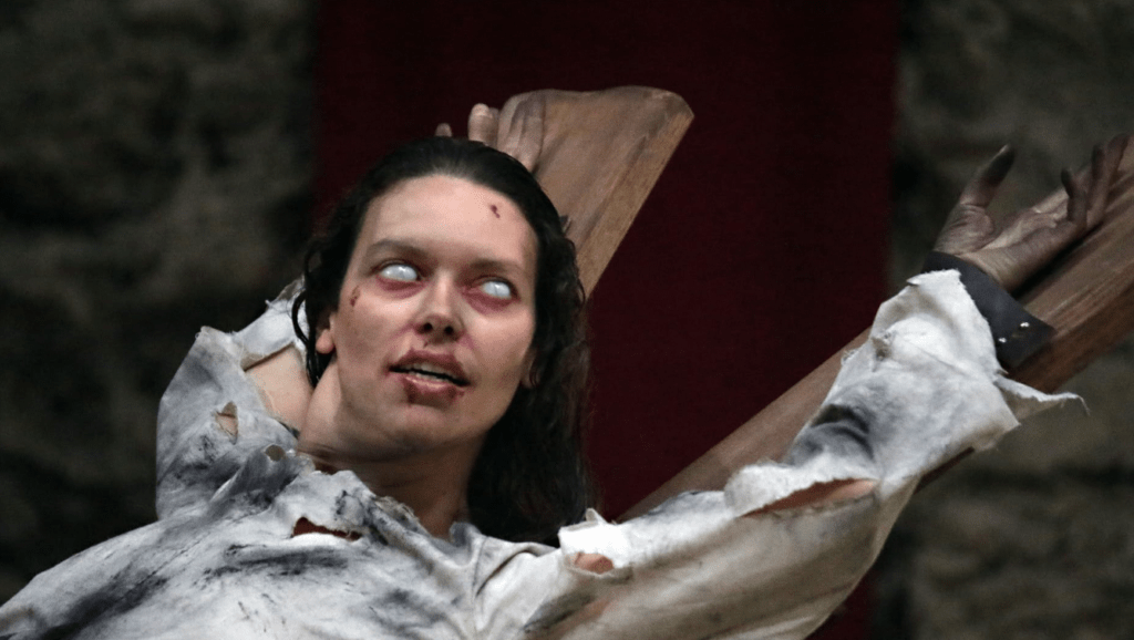 On retrouve dans La Malédiction des morts-vivants un certain nombre d’éléments à bannir typiques des petites productions B lorgnant vers le Z : une photographie grisâtre assez peu engageante ou trop chaude et totalement artificielle, des manquements terribles dans la direction d’acteurs, un scénario prétexte aux pistes pas inintéressantes (l’endoctrinement des masses), mais jamais développées… Cependant, la foi du réalisateur envers ses créatures met du baume au cœur, tant par sa façon de les filmer, de les mettre en valeur, que par leur aspect (maquillages très réussis) et dans les effets gores au sein de scènes assez cradingues et convaincantes. Raffaele Picchio multiplie les références, le film donne tout ce qu’il a et ça tombe bien, c’est un peu là qu’on l’attendait.