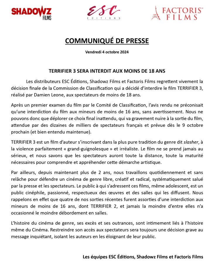 Le vendredi 4 octobre 2024, un communiqué a été diffusé sur les réseaux sociaux conjointement par Shadowz, ESC Editions et Factoris Films. Après examen du film par le Commission de Classification, le film sortira finalement en salles affublé d’une interdiction aux moins de 18 ans. Une véritable douche froide pour les fans et toute l’équipe du film dont la sortie va être fortement impactée ! Mais ce choix est-il vraiment justifié ?Clairement, Terrifier 3 est bien plus sombre que ses aînés. Au delà du scénario se déroulant à Noël qui est une fête familiale, il faut avouer que bon nombre de scènes sont assez choquantes. Les plus jeunes ne sont ici pas épargnés, le suicide, l’auto mutilation occupent aussi une place importante. Sans oublier les séquences gores qui raviront certes les amateurs du genre (mention spéciale pour la scène de la douche qui est une véritable masterclass), mais risquent aussi de choquer le jeune public. Une annonce choc que nous n’avions pas vu en France depuis la sortie de Saw 3 en 2006, mais qui est à mon sens, amplement justifiée, n’en déplaise à certains.