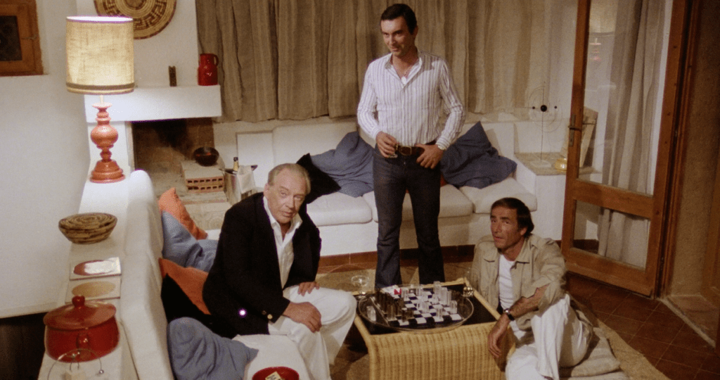 Totalement inédit en France jusqu’à aujourd’hui, Neuf Invités pour un crime de Ferdinando Baldi (Texas, addio, Blindman, le justicier aveugle) sort dans une édition HD grâce aux bons soins du Chat qui Fume. Ce giallo solaire prenant place sur un îlot rocheux retiré de tous en Sardaigne, bénéficie d’une belle vitrine pour être découvert. Le film prend la forme d’un whodunit à la Dix Petits nègres (OK, Ils étaient dix…) d’Agatha Christie. Après une scène de meurtre ouvrant le film et, on se le doute, détenant la clé du mystère, on découvre une famille relativement aisée et élargie, composée de neuf membres venus passer quelques vacances dans un lieu à première vue paradisiaque. Un semblant de cohésion familiale qui vole rapidement en éclat lorsque les différents protagonistes : père, fils, conjointes, commencent à dévoiler des animosités les uns envers les autres. Histoires de tromperies, de coucheries, de luttes autour d’un héritage, soit un véritable panier de crabes qui se trouve, de plus, bouleversé à la suite de la noyade d’une des filles, Carla, première de la liste à trépasser. Un événement fondateur qui va véritablement favoriser l’implosion de la cellule familiale. Un chaos naissant renforcé par la disparition du yacht qui mouillait au large, seule échappatoire désormais envolée, laissant les protagonistes seuls face à eux-mêmes et à leurs tensions.