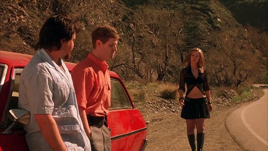 Trigger Warning : Monster Man s’avère très très bête dans ses dialogues, c’est évidemment voulu, comme une sorte d’exploration des limites de la vulgarité crasse, associée à une endurance sérieuse dans le domaine de la débilité profonde. Davis a la bonne idée d’assumer pleinement le caractère futilement bêta de ses personnages, en poussant à fond les potards des interactions bas du front, comme un Dumb & Dumber tartiné de barbaque. Entre le clone de Jack Black grande gueule qui provoque en permanence son acolyte, et le plus taiseux, qui plus est puceau, le cocktail s’approche de la formule du Buddy Movie, auquel s’ajoute l’auto-stoppeuse qui constitue un triangle amoureux vite fait bien fait, un nouveau fragment d’identité pour un film patchwork qui n’en manque déjà pas.
