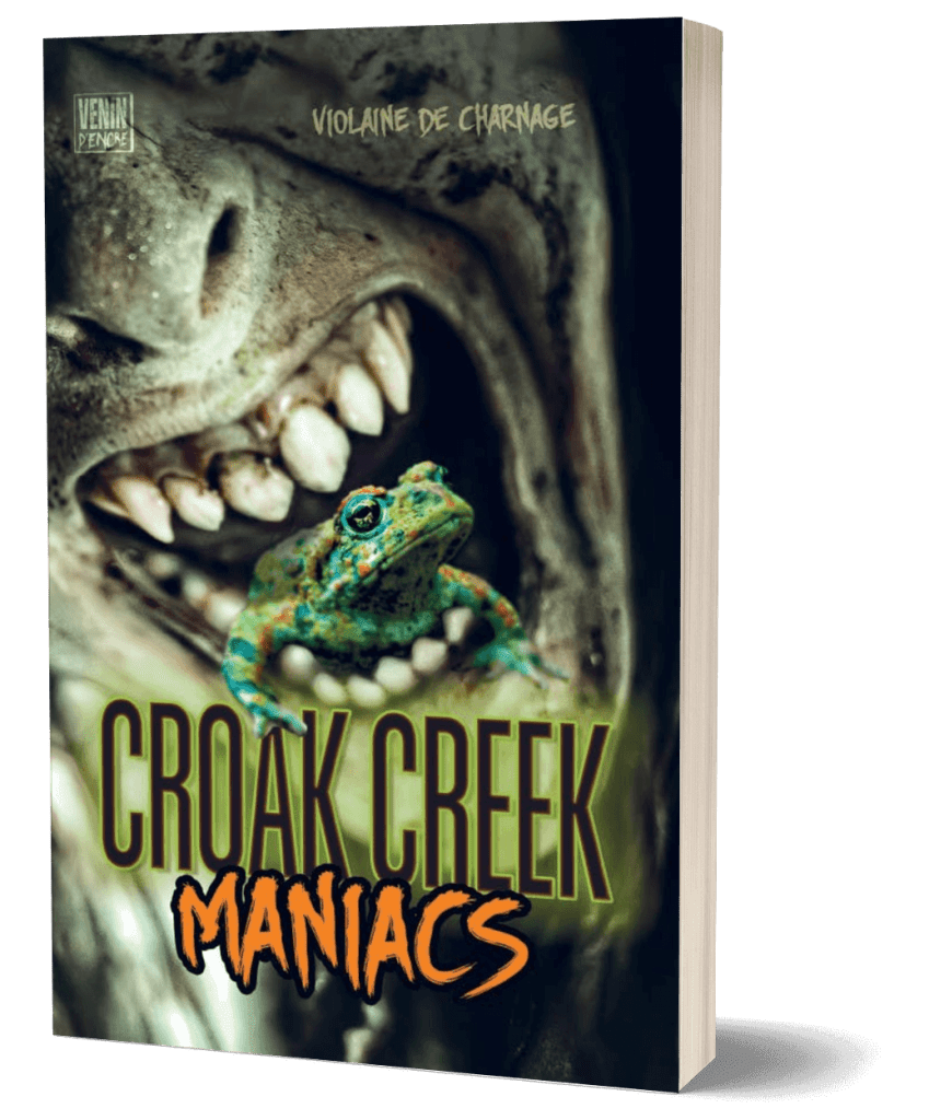 Et c’est là que déboule Croak Creek Maniacs, roman plus récent (publié en juillet 2025), mais pas moins furieux et gore. Violaine de Charnage ne s’est sûrement pas assagie entre les deux, sortant régulièrement romans, recueils de nouvelles, et autres matières rédactionnelles aptes à épancher sa soif d’horreur et d’hémoglobine.