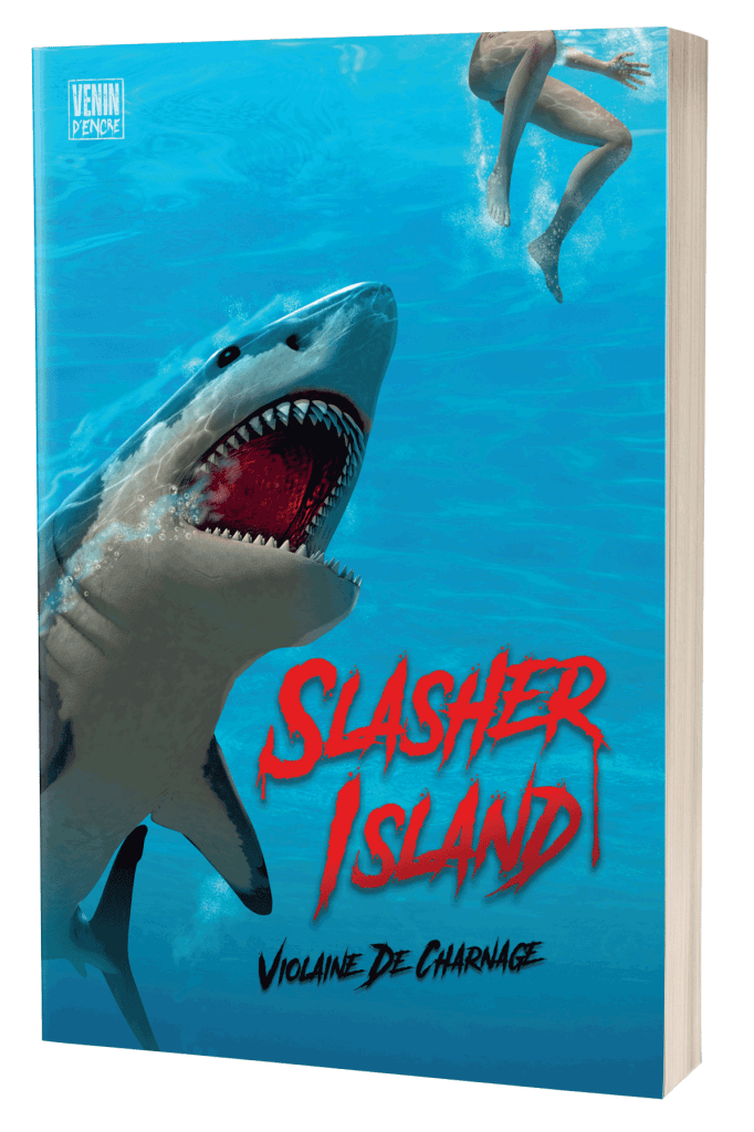 Dans un passé récent (janvier 2023), la romancière Violaine de Charnage publiait Screaming Boys dans la Collection KARNAGE chez Zone 52 Éditions. Depuis, le livre a été réédité en auto-édition chez Venin d’encre sous le titre Slasher Island. De fait, les deux titres tapent dans le mille d’un récit à la serpe où il est question d’une poignée de mâles en fusion entourés de quelques tentatrices, qui participent à une émission de télé-réalité sur une île retirée de tout. Un maniaque (costumé en requin ! Parce que pourquoi pas…) commence à trucider tout ce petit monde, sur fond de sexe décomplexé à outrance.
